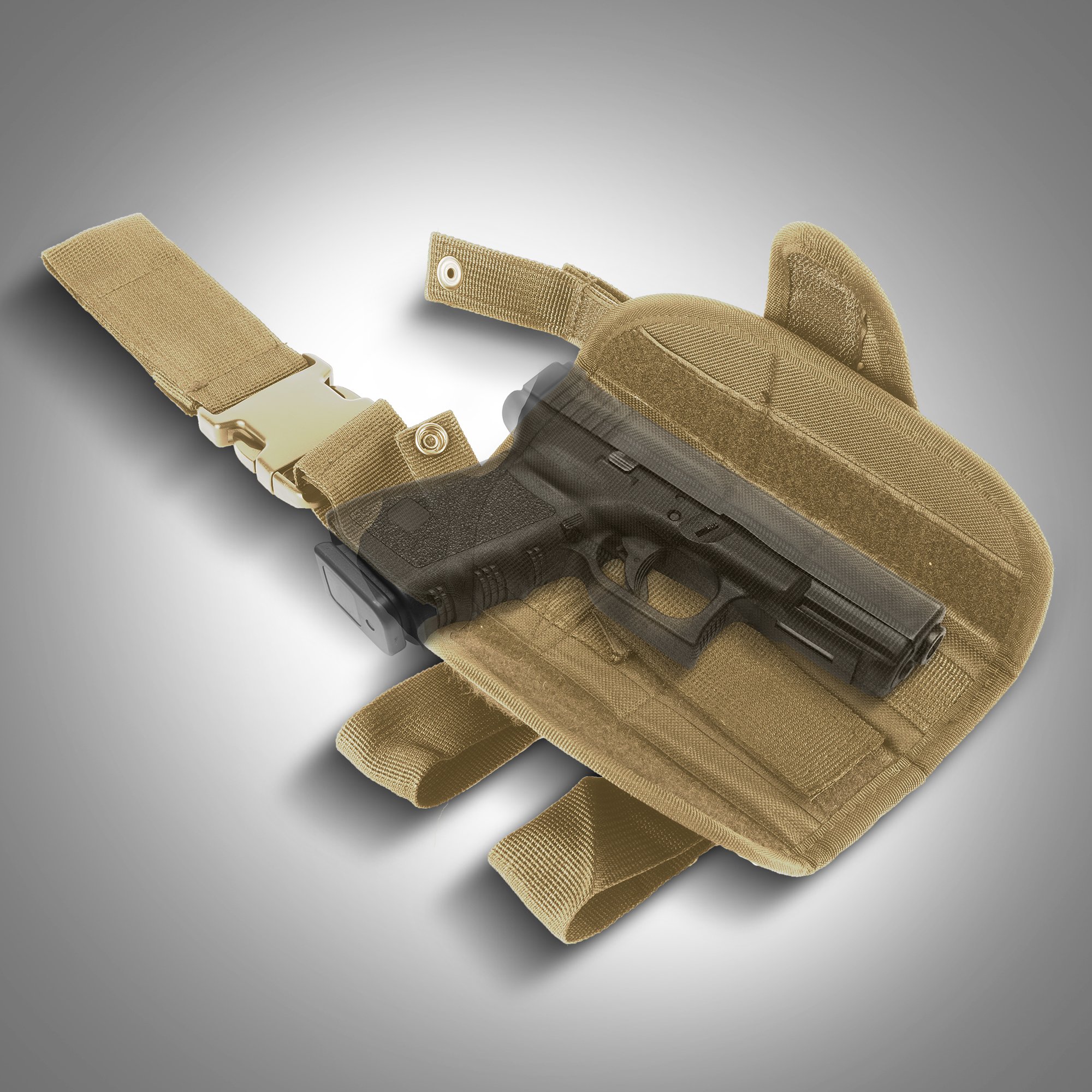 Designed to withstand the toughest outdoor conditions, the military thigh holster is made of high quality 500D nylon.  It is waterproof, scratch-resistant, wear-resistant and completely adjustable. The thigh holster also allows you to easily adjust the retention strap, the magazine retention strap, the ride on the holster, and the muzzle height to meet your requirements.