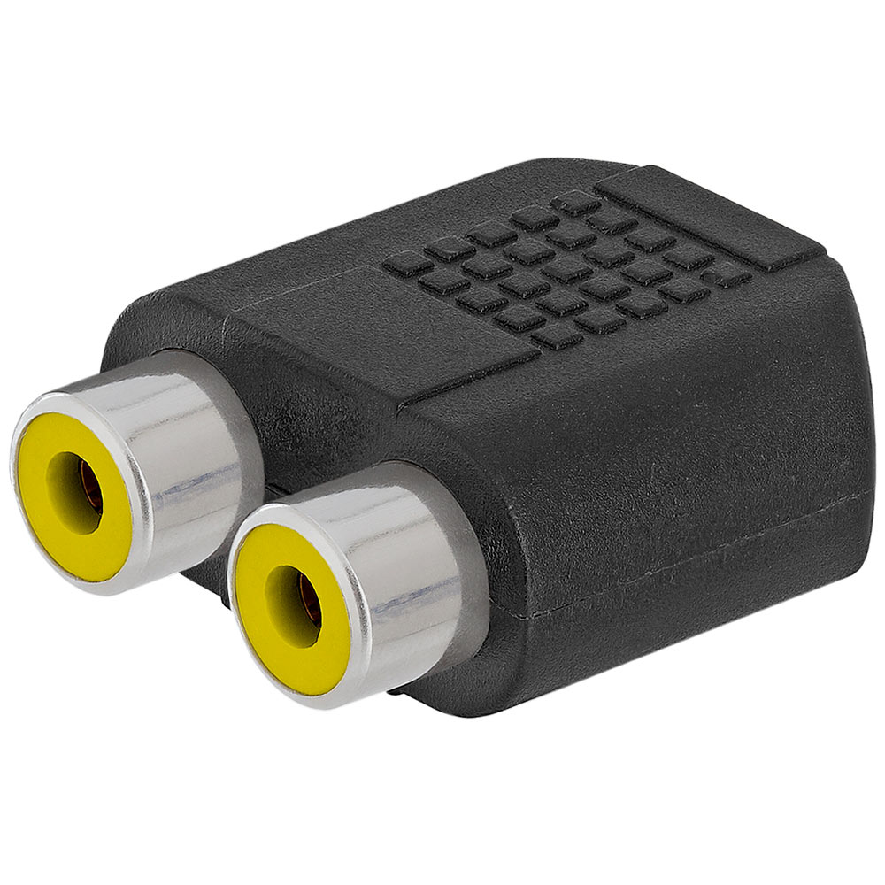 3.5mm Stereo Jack to 2xRCA Jack Adapter This 3.5mm Stereo Jack to 2xRCA Jack Adapter converts single 3.5mm Stereo Plug to two RCA Jacks. With its full molded construction, this splitter will split the audio signal without a loss of quality. Black molded plastic construction Nickel-plated contacts Connector 1: 3.5mm Stereo Jack Connector 2: 2xRCA Jack Use with PC, stereo, MP3 players External Length / Height: 33mm Body width: 25mm