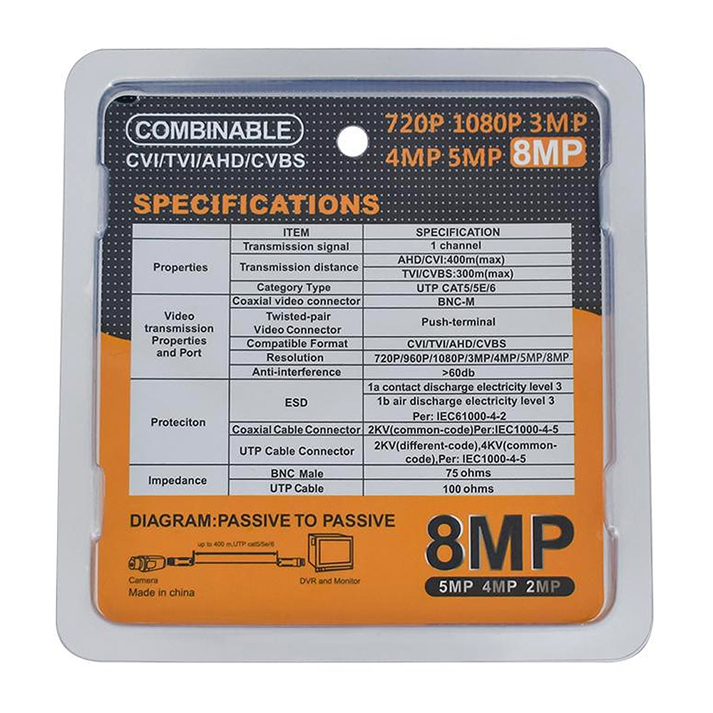 HD-CVI/TVI/AHD Video Balun CCTV BNC Passive Video Balun TransceiverOur newest Balun 8MP/4K HD Passive Video Balun Transmission Cable supports up to 8MP AHD Cameras over 250 meters, CVI cameras over 200 meters, TVI cameras over 150 meters (max). Gold Plated BNC connectors provide better transmission image quality and long-distance transmission. You can combine multiple pairs of 8MP video balun transmitter together side to side and made a neat line so they are more manageable if more than one video balun needed. We suggest using only with Cat5, Cat5e or Cat6 Lan cables. Features: BNC built-in network shrapnel to increase ground contact. A high value Q coil is used to increase the passivity of the 8MP signal. Dual PCB panel materials reduce the attenuation of high frequency signals. Integrated TV, three-level anti-thunder protection, safe and reliable. Support HD-CVI / AHD / TVI / CVBS video signals and support multiple baluns No external power supply required Compatible with HD-CVI/AHD/TVI/CVBS signals Easy to install with BNC head and clip-on interface ABS engineering plastic, light and durable. Good ability of lightning protection and anti-interference. Specifications: Transmission Signal: 1 Channel Transmission Distance: AHD/CVI: 400m(Max) / TVI: 300m(Max) Category Type: UTP Coaxial Video Connector: BNC-M Twisted-pair Video Connector: Push-terminal Compatible Format: HD-CVI/AHD/TVI/CVBS Resolution: 720P/1080P/3MP/4MP/5MP/8MP Anti-interference: >60dB Impedance: BNC: 75 Ohm; UTP: 100 Ohms