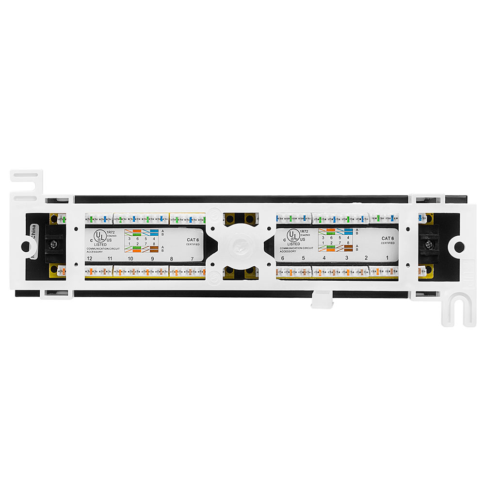 Compact Vertical Rack Mountable 12 port Cat 6 / Category 6 Mini Patch Panel.Cmple 12-Port Mini Patch Panels provide technicians and premise network installers with the ultimate solution for expanding a network in locations where space is at a premium.These compact, wall-mountable are compatible with both T568A and T568B wiring configurations to provide greater flexibility in accommodating any type of performance specification.Patch panels are used to connect & rout circuits. They are primarily used in computer networking but also in recording studios radio & television.Small footprint saves space and allows optimum use of valuable rack space. Conveniently numbered and writeable port labels on the front panel.Compatible with both 568A and B standards with easy-to-read color code diagrams in back. Takes standard 110 blade punch downs.Provides tight, secure, positive contact and transfer of signals. Bracket frame with screw eyelets for easy attachment to rack frame.Specifications:12 Port UTP CAT6 Wall-Mount Mini Patch PanelCompatible with both 110 and Krone punch-down toolsT568A and T568B dual wiring options50 microns gold over nickel plating on contactsMeets or Exceeds ALL EIA/TIA StandardsSupports 22 to 26 AWG stranded and solid wireCompliance with the ANSI/TIA/EIA 568 B.2 standardFits into a tight network closet space
