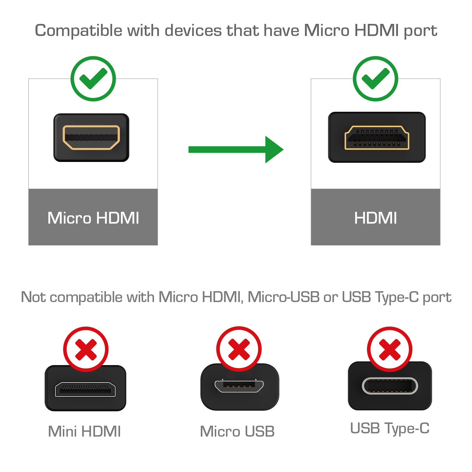 6FT Micro-HDMI (Type D) to HDMI (Type A) Cable Please check your mobile owners manual to see if your mobile device is comparable with the Micro HDMI This extra thin and flexible Micro HDMI High-Speed Male To HDMI Male Cable is used to connect Smartphone's, cameras, and other portable devices into any TV lets you instantly plug your tablet, GoPro, Lenovo Yoga, digital camera, notebook, Ultra-book into any TV for instant broadcasting at family get-together, meetings, and even tailgate parties. This cable lets you watch videos, stream media, or view documents from your device with a Micro-HDMI port on your TV. This is the easy streaming solution that you have been waiting for. Our cables comes with a limited lifetime warranty! Specs & Features: Length: 6 feet Fully HDCP compliant Cable Supports 3D 4K 60Hz Supports the following resolutions: 720i, 720p, 1080i, 1080p, 1280x1024, 1440p and beyond Supports True HD Dolby 7.1 and DTS-HD Master Audio It has a micro HDMI (type D) connector on one end and an HDMI connector (type A) on the other end Gold-plated terminals ensure long-lasting, corrosion-free connections Color: Black Many smartphones ONLY have a Micro USB Port, and not a Micro HDMI port. Please make sure that your phone actually has a Micro HDMI port before purchasing this cable. Both connections look similar to each other, so just double check that your phone has a Micro HDMI port before purchasing. Superior Construction: 100% Satisfaction: Your complete satisfaction is our number one priority! If for any reason your purchase does not give you complete satisfaction simply contact us for a replacement or refund.