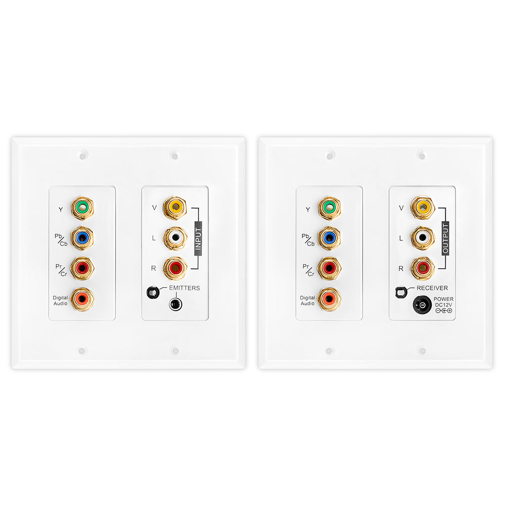 5 in 1 Professional System. Easy to Install. Component Video Composite Video Digital Audio Analog Audio IR Repeater Remote Extender Our Component Video + Digital Audio, Composite Video + Analog Audio and IRRepeater system allows you to use a double Category 5e/6 cable to send HDTV+ Digital Audio up to 330 ft. It used in pairs and supports 480i, 480p, 720p, 1080i, and 1080p video formatsfor hi-definition (HDTV) video applications. This is ideal for systems where high resolution YPbPr component video signalsalong with Digital or Analog audio signals must be transmitted long distancesto your display. IR System Overview: An infrared (IR) extender system enablesyou to control your IR remote controlled A/V equipment from a remote location.This enables you to place your A/V components out of sight (behind cabinet doors,in the rear of a room, or in a different room) and still conveniently controlyour equipment. Composite Video + Analog Audio Specifications: Interface: Video: 1x RCA Jack Audio: 2x RCA Jack Left and Right AudioJack UTP: 110-Type Punch down Impedance: Video:100 ohm Audio: 600 ohm UTP: 100 ohmBandwidth: Video: DC- 12 MHz Bandwidth: Audio: 50 Hz - 15 KHz Distance: Audio/Color Video: Category 5e UTP cable up to 100 Meters (330 ft) Component Video + Digital Audio Specifications: Interface:Component Video: 3x RCA (Y/Pb/Pr) female connectorDigital Audio: 1x RCA Jack female connectorUTP: 110-Type Punch down Impedance:Video: 75 ohm unbalancedDigital Audio: 75 ohm unbalanced UTP: 100 ohm balanced Bandwidth: Video: DC- 60 MHz Bandwidth: Audio: DC-25 MHz Distance: Over Category 5e/6 UTP cable:480p Video = 100 meters ( 330ft ) 720p 1080i Video = 75 meters ( 245 ft ) 1080i = 50 meters (165 ft )Digital Audio: 100 meters ( 330ft ) IR Repeater Extender Specifications: Receive Frequency Range - 34 kHz to 40 kHZ Transmit Frequencies - 38 kHz Power - 12VDC, 31 mA Max CFL friendly - Allows installation with CFL lighting Cord Length - IR emitter 10 ft on IR emitter Cord Length - IR receiver 10 ft on IR receiver Blue IR Confirmation LED on receiver AC Adapter Included in the package: In wall AV Receiver In wall AV Transmitter Surface mount IR Receiver = 1 Dual Head IR emitter = 1 Dual Decora Style Wall Plate = 2 AC Adapter Manual Have more AV equipments? We have an extra Emitters Some cable boxes like the SA HDTV DVR's and DirectTV H21 use a higher frequency. We would recomend adding the Dual Frequency IR Receiver. Replace the IR Receiver that comes with the original IR System to the Dual Frequency IR Receiver!