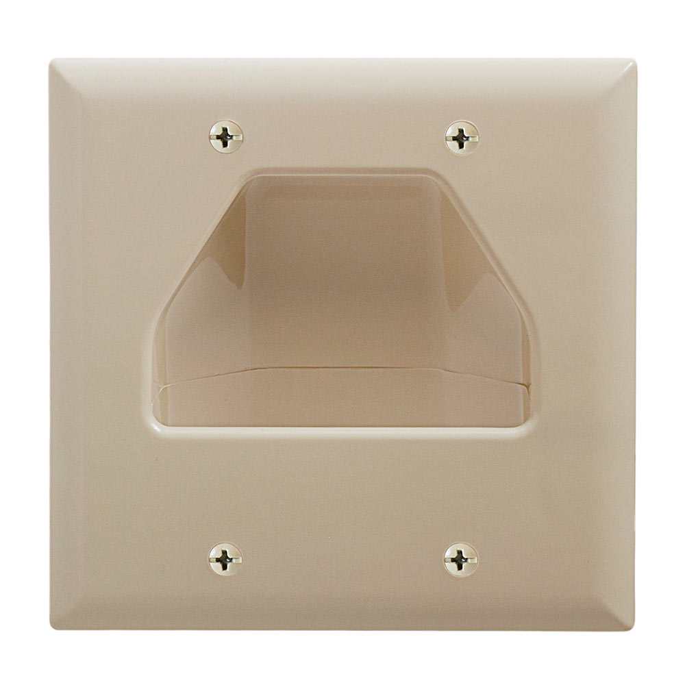 Two-Gang Recessed Low Voltage Cable - Ivory You’ve decided that you want to go all the way with your home theater or surround sound audio system, with high-quality components and all of the wiring run through the walls. Not only will the video and sound be impressive, but just walking into the room will inspire a feeling of awe because of the gorgeous equipment and the intelligent, effective layout. Everyone will be convinced that a professional designed and installed the entire thing. But what do you do with all of those cables? The more complicated the system, the more cables you have connecting all of the video and audio inputs and outputs. Sure, the bulk of the cabling will be running through your walls, but that still means a dozen (or more) of them will be poking out of the wall in various spots, so they can connect to their respective components. The last thing you want is to have ugly holes where the cables emerge from (or disappear into) the walls, and you also don’t want to have to drill tons of holes to accommodate all of the different sizes of cable. It is, as the King of Siam once said, “a puzzlement.” You don’t need Anna to solve the “puzzlement” when Cmple is here to help with our two-gang recessed low-voltage cable wall plate. This plate attaches flush to your wall with an opening for low-voltage cables that’s approximately 1 ½ inches by 2 inches; you can feed multiple cables, of all different sizes, through the same opening. This provides the ultimate in versatility: an HDMI cable can be fed out through the plate to your wall-mounted monitor, while cables from a satellite or cable box, Blu-ray player, audio receiver, video gaming system and whatever else you have in your installation can all be fed in through the plate at the same time. It’s the ultimate in attractive flexibility. One reason our Cmple low-voltage cable wall plate is so attractive is that the cable opening is recessed. In that way, the plate will remain flush to your wall while still allowing for different types and widths of cable to easily feed through without the “bumps” which can ruin the look of a room, and also letting you position your furniture or TV as close to the wall as you’d like. It adds the finished look so important to a professional installation; in fact, this is exactly what many professionals use to complete their high-priced work. The other reason it’s so attractive is that it eliminates the need for a “police lineup” of cable plates across the wall. All of the low-voltage cabling fits right through the same plate, so you only need one to accomplish the job of several. Taking a look at the key specifications for the Cmple two-gang low-voltage recessed cable wall plate: Two gang finished plate Recessed opening for cables Accommodates all types and sizes of low-voltage cables Hole opening: 1 5/16 inches wide by 1 15/16 inches high Color: Ivory with matching screws Installing a beautiful home theater or audio system requires you to give as much thought to the details as you do to the components. This wall plate is a small detail, but the effect it will have on the look of your finished room is enormous.