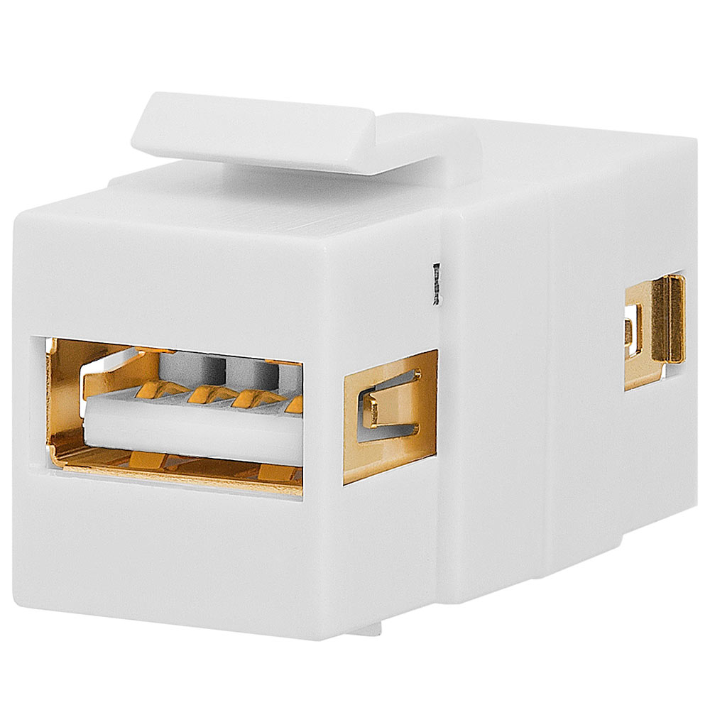 Keystone Jack - USB 2.0 A Female to A Female Coupler Flush Type - White The USB 2.0 Female to Female modular setup could be used for computer data transfer, USB devices, external hard drives, etc. By running your wires in the wall, your setup will be clutter-free and relieved from eye-sores. Here’s an in-depth look at the specifications of this USB keystone jack: Allows USB cables to be passed through panels, enclosures and wall plates Connector A: USB A Female on the front Connector B: USB A Female on the back Snap-In USB Keystone Module Gold plated Color: White