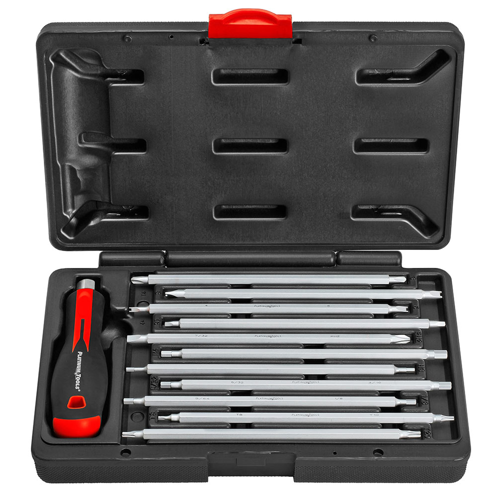 Platinum Tools 22-in-1 Security Screwdriver Kit The perfect set for security installers - reach into those deep crevices with ease and never be without the right screwdriver. It features a non-slip, comfort grip handle with a high impact plastic core and 11 double sided security shaft style bits. The shaft style enables access into recessed screws up to 5 inches deep. The bit load includes multiple sizes of security Torx® hex and Robertson along with spanners and tri-wings so the list of applications is endless. This kit can be used on standard hex and torx screws and includes a slotted and Phillips head bit for traditional screwdriver applications. Security Torx® T8, T10, T15, T20 Security Hex: 1/8inch, 9/64inch, 5/32inch, 3/16inch (2.5mm, 3mm, 4mm, 5.5mm) Spanner: 4, 6, 8, 10 Security Robertson: 1, 2 Tri-Wings: 2, 3 Slotted and Phillips: Slotted: 7/32, Phillips: 2