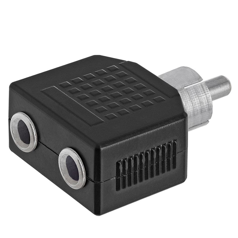 RCA Plug to 2x3.5mm Mono Jack Adapter This RCA Plug to 2x3.5mm Mono Jack Adapter converts two 3.5mm Mono Plugs to single RCA Plug. With its full molded construction, this splitter will split the audio signal without a loss of quality. Black molded plastic construction Nickel-plated contacts Connector 1: RCA Plug Connector 2: 2x3.5mm Mono Jack Use with PC, stereo, MP3 players External Length / Height: 33mm Body width: 27mm