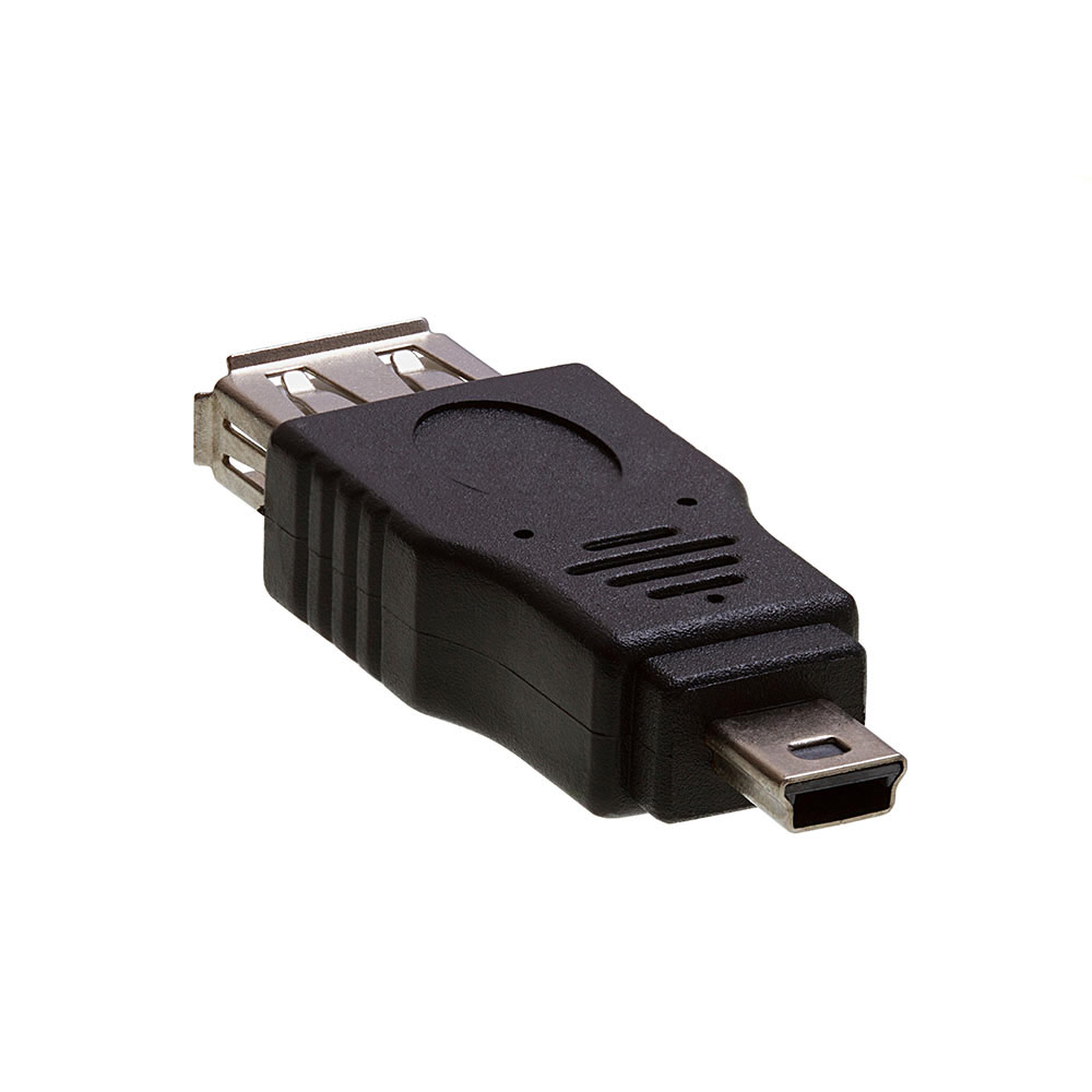 USB 2.0 A Female to Mini B 5-Pin Male Adapter This USB A Female to Mini B 5-Pin Male adapter converts any USB A Male connector to a USB Mini B 5Pin male port. Connector 1: USB 2.0 Type A Female Connector 2: USB 2.0 Type B Mini 5-Pin Male Fully molded design provides durability Silver plated contacts Easily convert existing cables to your needs Color: Black