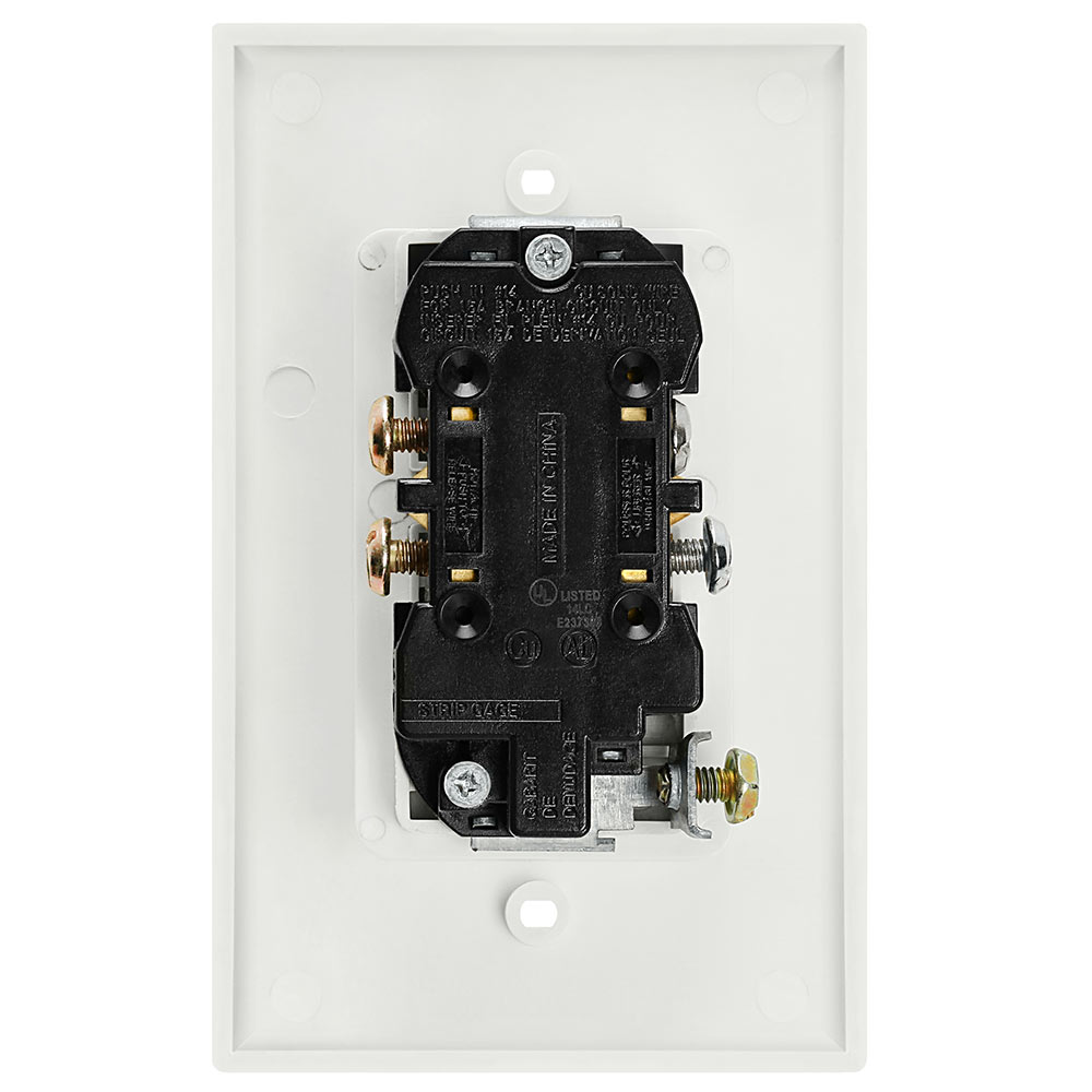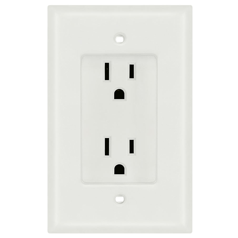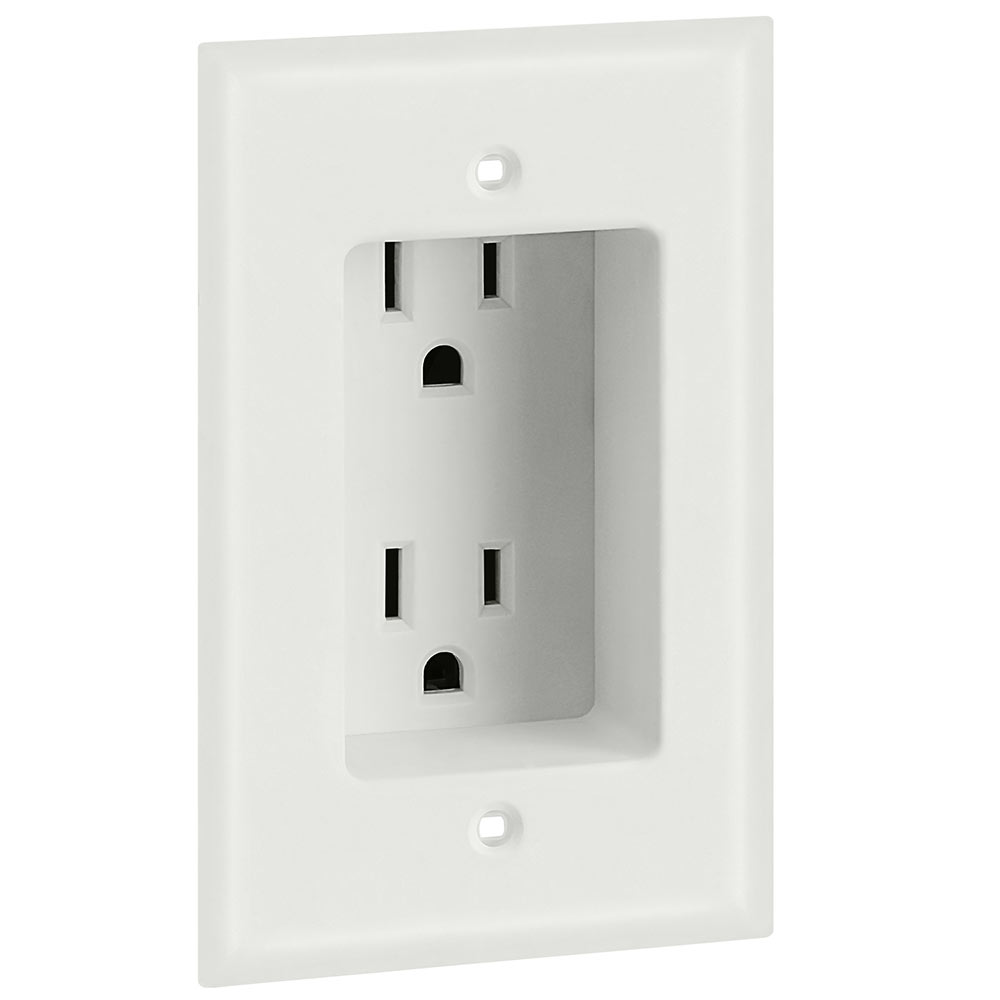 1 Gang Recessed Dual Power Outlet, UL Listed This product has a minimalist design that is sleek and unnoticeable. Perfect for remodeling or new construction projects, this power outlet creates 1 inch of extra room to connect to your devices. It comes with a built-in wall plate and works great behind flat screen displays. Features: 125V 15Amp Self-grounding UL-Listed Color: White Dimensions: 4.5/8in x 2.7/8in x 2in, 1in recessed area