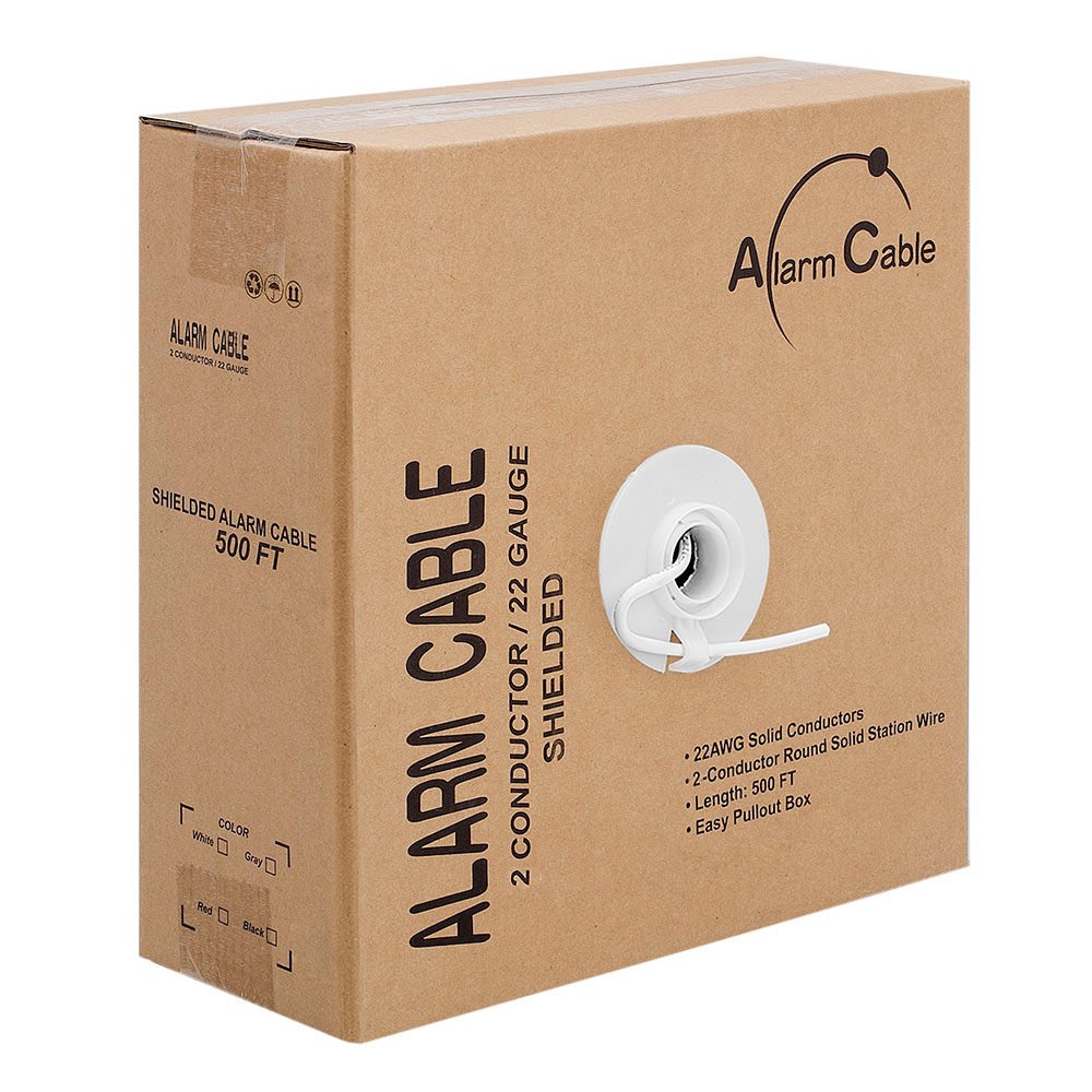 22/2 CCA 500 feet Shielded Alarm Solid Cable White This product features a 500ft 22AWG 2 conductor round Security Alarm CCA cable with aluminum foil shielding. This cable is suitable for alarm security systems and other low voltage electrical hookup applications. You can use it to connect door and window sensors, motion detectors, keypads and other hardwired accessories to your alarm panels. The aluminum foil shielding provides protection from power frequency and radio frequency interference, reducing the number of false alarms being generated. The cable comes in a pull out box making it easy to use. Cable Gauge: 22AWG 2 Conductor round solid station wire Aluminum foil shielding Easy to use pull our box Cable Conductor Material: CCA Cable Length: 500ft