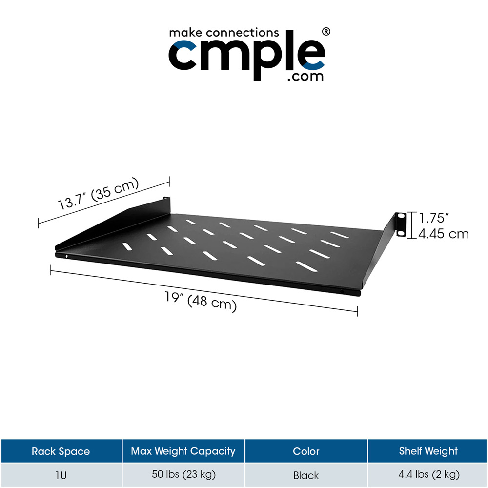 1U Vented Server Rack Shelf Add even more functionality to all of your 2 or 4-post open frame racks and wall-mount rack enclosures! These fixed rack shelves are cantilevers, meaning they mount to the rack at only one end of the shelf. Make the most out of your open frame racks and wall-mount enclosures by customizing their configuration with this shelving wherever you need it.These 1 unit space server and rack case shelves are ideal for keeping your server or rack case clean and organized. Cmple shelf allows you to add space to open frame racks and wall-mount enclosures that accommodate tower UPS systems, monitors, or any other equipment that isn't rack-mount. The unit mounts easily in standard racks with the included hardware and provides space for non-rack mountable equipment.These shelves are universal for customizing your setup more than you can expect. In 2-post racks, two shelves can be mounted back-to-back to create a deep, fixed shelf. This shelf can be mounted upside down to fit a wider variety of needs for different types of electronic equipment. Vented openings can be used as lacing slots allow straps to be looped through to secure equipment to the shelf.Features:Takes up 1 Unit of spaceCompatible with standard 19-inch racksThe vented design promotes air circulationUsed with 2‐Post, 4‐Post Racks, cabinets, and wall racksDimensions: 19inch W x 1.75inch H x 13.7inch DUsable shelf space: 18.6inch W x 13.3inch DMaterial: 18-Gauge SPCC Cold Roll SteelBlack Powder Coating FinishHolds up to 4.4lbs (2.2kg)Package Includes:1 x 1U Vented Rack-Mount Shelf4 x #12-24 Cage Nuts and Screws