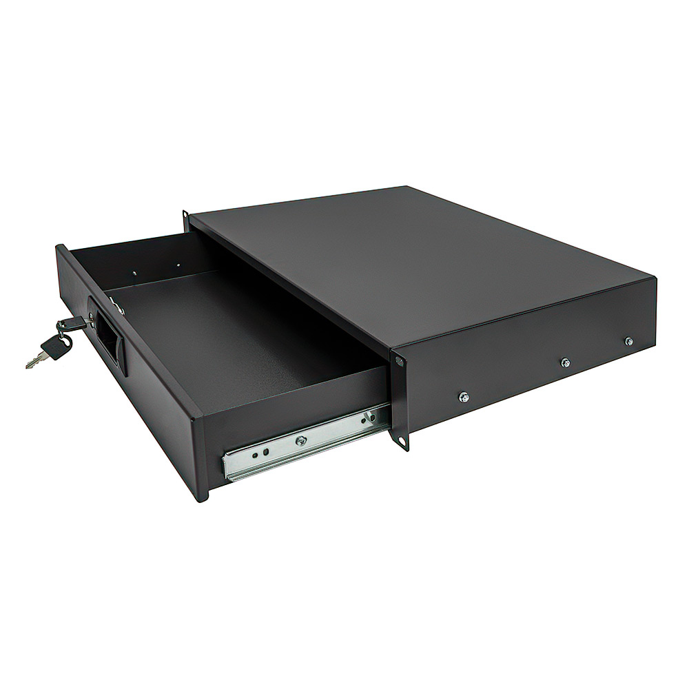 2U Server Rack Drawer Add even more functionality to all of your 2 or 4-post open frame racks and wall-mount rack enclosures! This 2U locking rack mount drawer by Cmple installs and slides easily to add useful, secure storage to any standard 19-inch server rack, enclosure, or cabinet. The pre-installed lock ensures to safeguard from damage, theft, and tampering. These drawers are universal for customizing your setup more than you can expect. Designed for storage software, non-rack equipment, tools, user guides, cable management supplies, patch cables, and other gear that you need handy to get the job done right.The drawer itself is very stable, it is made of thick sheet metal with a black powder finish. Comes with a non-slip, perforated liner that provides a protective layer between electronic accessories and the drawer's metal surface. For fast installation, rack drawers ship fully assembled and include all necessary mounting hardware and keys.Features:Convenient and Secure StorageInstall easily into a standard 19-inch rack or cabinetKeep your workspace tidy and your equipment accessibleLocking design secures equipment and prevents tamperingDurable steel construction and smooth, reliable slidesDimensions: 3.5inchH x 19inchW x 14inchDMaterial: Cold Rolled SteelBlack Powder-Coated FinishMatch Rack and Enclosure ColorUp to 35 lbs Weight CapacityDeep: 13.8inch interior (14inch exterior)Package Includes:1 x 2U Lockable Rack-Mount Drawer4 x M6 Screws4 x M6 Cage Nuts2 x Key