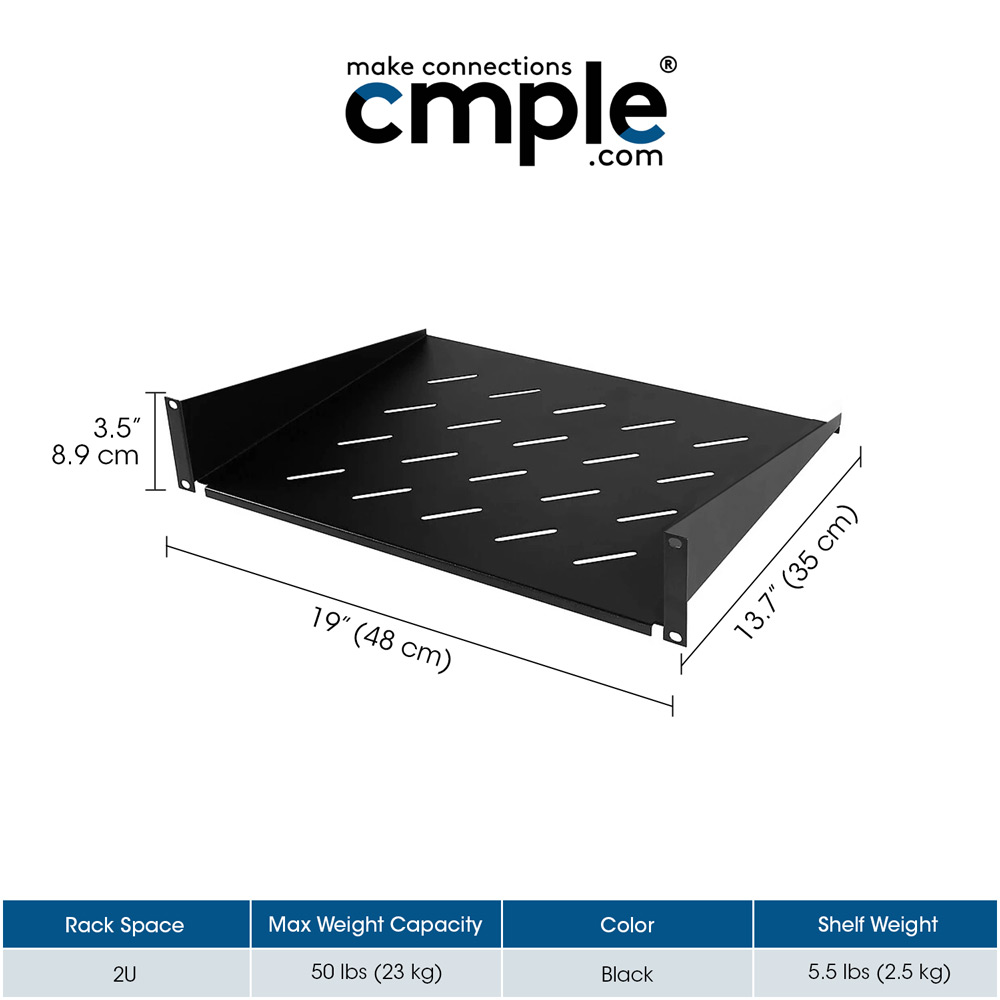 2U Vented Server Rack Shelf Add even more functionality to all of your 2 or 4-post open frame racks and wall-mount rack enclosures! These fixed rack shelves are cantilevers, meaning they mount to the rack at only one end of the shelf. Make the most out of your open frame racks and wall-mount enclosures by customizing their configuration with this shelving wherever you need it.These 2 unit space server and rack case shelves are ideal for keeping your server or rack case clean and organized. Cmple shelf allows you to add space to open frame racks and wall-mount enclosures that accommodate tower UPS systems, monitors, or any other equipment that isn't rack-mount. The unit mounts easily in standard racks with the included hardware and provides space for non-rack mountable equipment.These shelves are universal for customizing your setup more than you can expect. In 2-post racks, two shelves can be mounted back-to-back to create a deep, fixed shelf. This shelf can be mounted upside down to fit a wider variety of needs for different types of electronic equipment. Vented openings can be used as lacing slots allow straps to be looped through to secure equipment to the shelf.Features:Takes up 2 Units of spaceCompatible with standard 19-inch racksThe vented design promotes air circulationUsed with 2‐Post, 4‐Post Racks, cabinets, and wall racksDimensions: 19inch W x 3.5inch H x 13.7inch DUsable shelf space: 18.6inch W x 13.3inch DMaterial: 18-Gauge SPCC Cold Roll SteelBlack Powder Coating FinishHolds up to 5.5lbs (2.5kg)Package Includes:1 x 2U Vented Rack-Mount Shelf4 x #12-24 Cage Nuts and Screws
