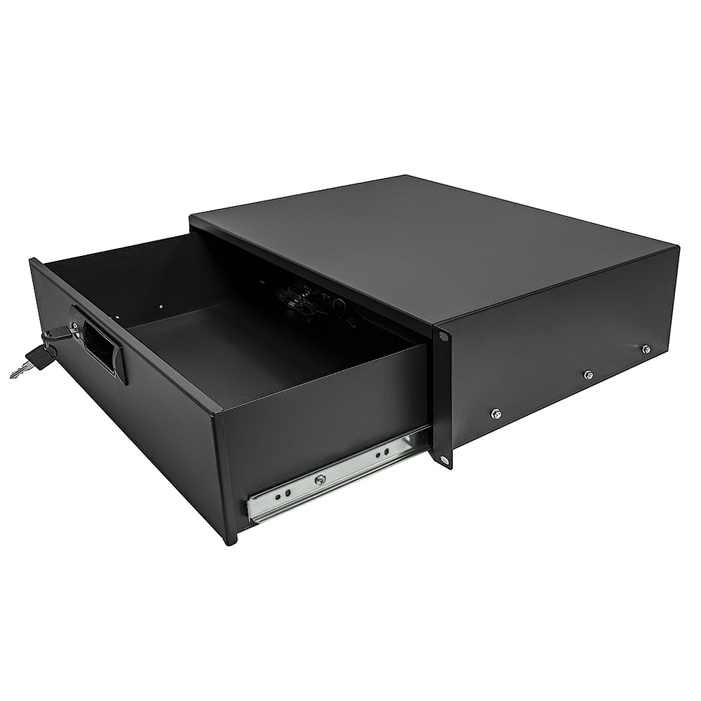 3U Server Rack Drawer Add even more functionality to all of your 2 or 4-post open frame racks and wall-mount rack enclosures! This 3U locking rack mount drawer by Cmple installs and slides easily to add useful, secure storage to any standard 19-inch server rack, enclosure, or cabinet. The pre-installed lock ensures to safeguard from damage, theft, and tampering. These drawers are universal for customizing your setup more than you can expect. Designed for storage software, non-rack equipment, tools, user guides, cable management supplies, patch cables, and other gear that you need handy to get the job done right.The drawer itself is very stable, it is made of thick sheet metal with a black powder finish. Comes with a non-slip, perforated liner that provides a protective layer between electronic accessories and the drawer's metal surface. For fast installation, rack drawers ship fully assembled and include all necessary mounting hardware and keys.Features:Convenient and Secure StorageInstall easily into a standard 19-inch rack or cabinetKeep your workspace tidy and your equipment accessibleLocking design secures equipment and prevents tamperingDurable steel construction and smooth, reliable slidesDimensions: 5.24inchH x 19inchW x 14inchDMaterial: Cold Rolled SteelBlack Powder-Coated FinishMatch Rack and Enclosure ColorUp to 35 lbs Weight CapacityDeep: 13.8inch interior (14inch exterior)Package Includes:1 x 3U Lockable Rack-Mount Drawer4 x M6 Screws4 x M6 Cage Nuts2 x Key