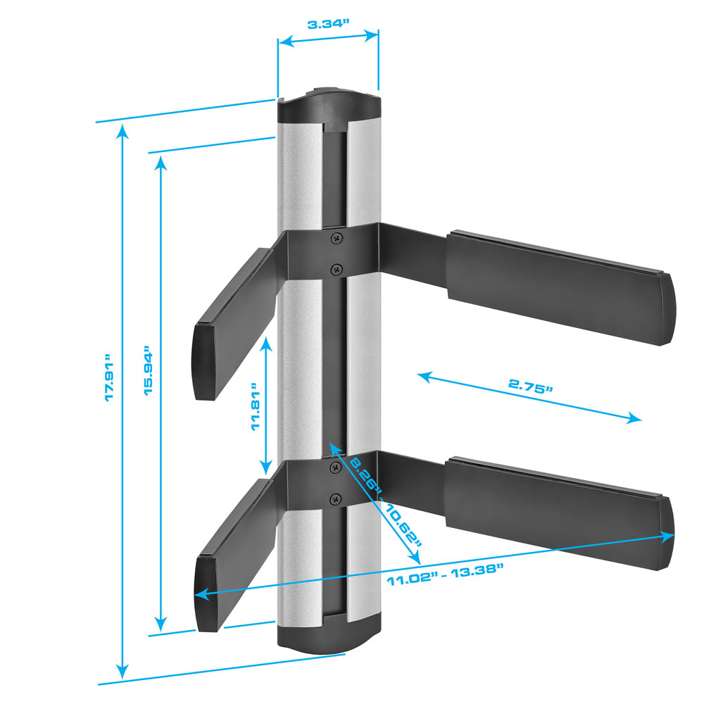Universal Adjustable AV Support DVD Wall Mount - Two Shelves (Maximum 11 Pounds) Did you ever try to install several wall shelves in a room where everything had to look perfect and there was no room for error? Not easy, was it? In fact, you probably wished (more than once) there was a much easier way to deal with the situation. Enter the Cmple universal, adjustable AV support DVD wall mount with two shelves. This clever and compact unit is perfect for quickly and simply installing two “wall shelves,” which can hold two components for your audio-visual system such as Blu-ray players or set-top boxes - and it eliminates the need to wrestle with large and difficult-to-install shelving. And there’s no muss, no fuss, and virtually no chance you’ll mess up the installation in your beautiful new AV or living room. Here’s what’s behind this attractive, black-and-silver wall mount: a small pillar that only measures about a foot-and-a-half tall and just over three inches deep. After you attach it to the wall, you simply open the two sets of black arms (which extend wide enough to hold almost any AV component comfortably) and place one component onto of each set of arms. You can adjust the arms to fit the width of the cable box or DVD player, and you can move each set up or down on the pillar so there’s enough room to match the components’ height. The only constraints are that the boxes can’t weigh more than a total of 11 pounds, and can’t be more than 18 inches tall. This mount is infinitely easier to install than heavy, bulky shelves which might take two people using a rule, a level and who knows what other tools. And with its silver-and-black pillar and black arms made of aluminum and steel, it’s probably sturdier and better looking than any shelves you’d put up yourself. It’s also a far better alternative than putting the Blu-ray player and set-top box on nearby cabinets or tables - or the floor - and running unsightly wires to your television. The Cmple AV universal mount even comes with a cable management system to keep all of the wires you need to run between units nicely organized and out of sight. All anyone will be able to see are the two components being held in place, the jet black shelves, and maybe a few inches of the attractive mount pillar. Everything will blend right in with the television and the rest of your room. Checking out the key specifications of the Cmple two-shelf universal adjustable AV support DVD wall mount: Fits DVD players, Blu-ray players, set-top boxes, and other AV components Maximum dimensions of components: 9.25 inches (length) x 13.38 inches (width) x 17.91 inches (height) Back pillar size: 17.91 inches (height) x 3.34 inches (width) Holds audio/video components to a total weight of 11 pounds (5 kg) Materials: steel and aluminum Installation instructions included Cable management included Adjustable shelf can be adjusted to match component width, depth and height Two shelves The Cmple two-shelf wall mount is modern and attractive, easy to mount, fully adjustable and easy to use, and extremely inexpensive. What could be a better way to take care of your component storage problem than that?