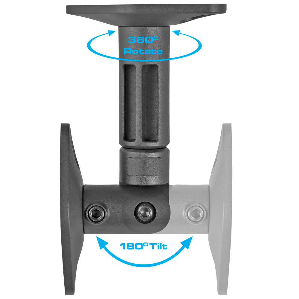 Speaker Wall/Ceiling Mount for Satellite Speakers - Black, Pair Speaker brackets allow speakers to be mounted on walls or ceilings, allowing you to place speakers at acoustically intelligent, strategic, and optimal locations while saving space, creating convenience, and enhancing aesthetics. Using these mounting brackets, you can have peace of mind in the security and durability of your speaker attachments. Specifications & Features: For Speaker mount Universal design fits most brands Includes 1-,2- and 4-Hole Adapters Simple tilt, pivot and rotation adjustments Support speakers up to 3.5kgs / 7.7 lb Wall Mounting & Ceiling Mounting Color: Black Installation instructions included Comes in a pack of 2 speaker brackets