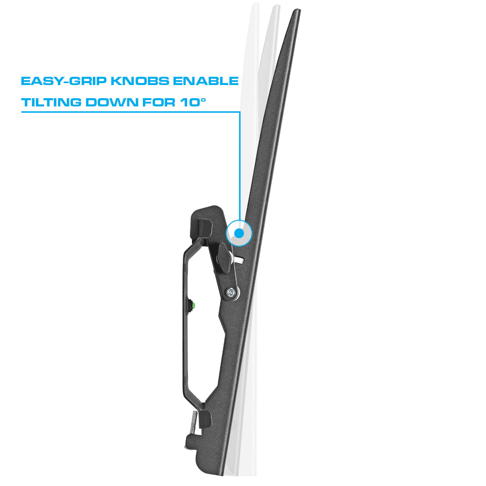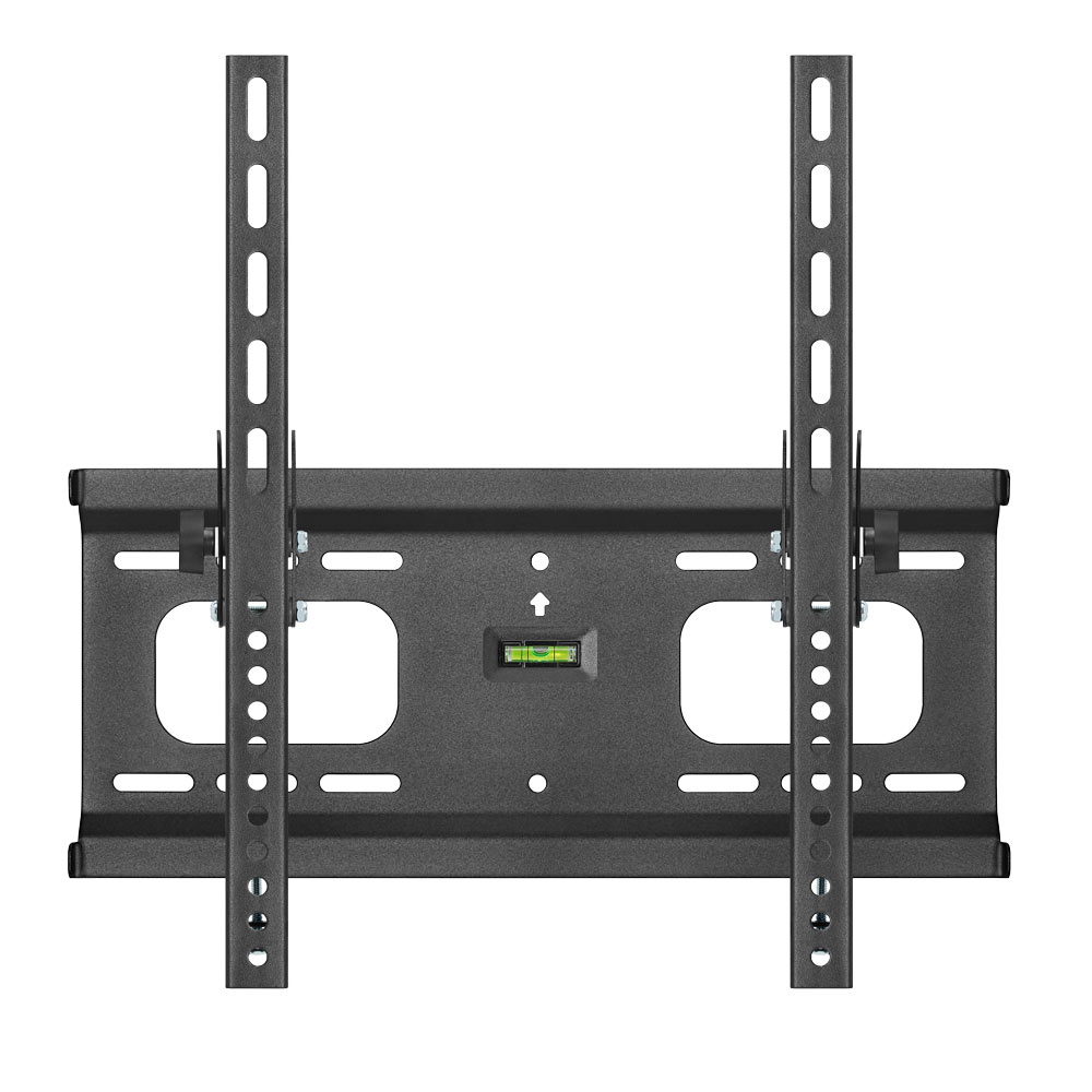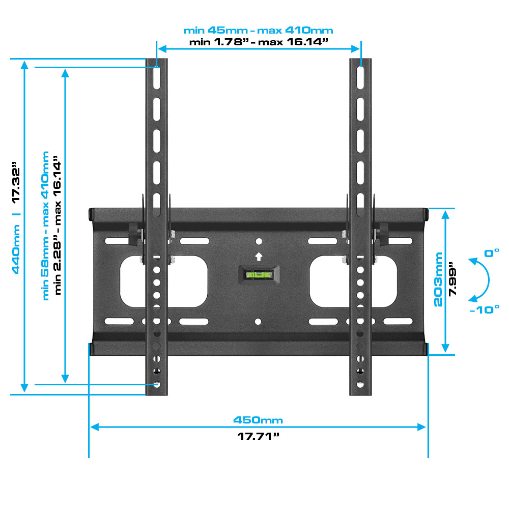 Heavy-Duty Tilt TV Wall Mount for 32inch-55inch LED, 3D LED, LCD, Plasma TV's The universal hole pattern allows the wall mount to hold TV's from 32inch to 55inch. Hanging TVs bigger or smaller then the specified size is not recommended. The wall mount has a maximum load weight limit of 75kg or 165lb. This means that hanging anything heavier than 165lb/75kg is not recommended and not safe. Once you hang your TV on this bracket, the distance between the TV and the wall will be 1.81in. This will allow you to leave enough space for the cables that are plugged in to the TV. This feature is useful in particular when your cables are not coming out of your wall directly behind the TV. Another useful feature of this wall mount is a bubble level. The bubble level will help to hang your TV at the straight angle without having to use fancy, expensive laser precision tools. Tilting option: This bracket will allow you to tilt the TV from - 10 degrees to 0 degrees. This feature is especially convenient if you need to change the angle of your TV upwards or downwards in order to adjust the monitor position according to your preferences. This option is available whether it's hung up or at the mid-lower level. Features & Specifications: -10 degrees - 0 degrees up and down tilt Universal hole patterns 16.14 in x 16.14 in (410mm x 410mm) Vesa compliant:100x100, 200x100, 200x200, 400x200, 400x400 Support flat panel TV up to 165 LB Distance from TV to Wall: 46 mm (1.81 in) Integrated bubble level assures easy installation allignment Open architecture provides superior ventilation and easy access for cable management Color: Black This bracket is not only handy, but also safe. It has been tested for the presence of Lead, Cadmium, Mercury, Hexavalent chromium, Polybrominated biphenyls, and Polybrominated diphenyl ethers, which are hazardous for the human thehealth if used in above normal amount.