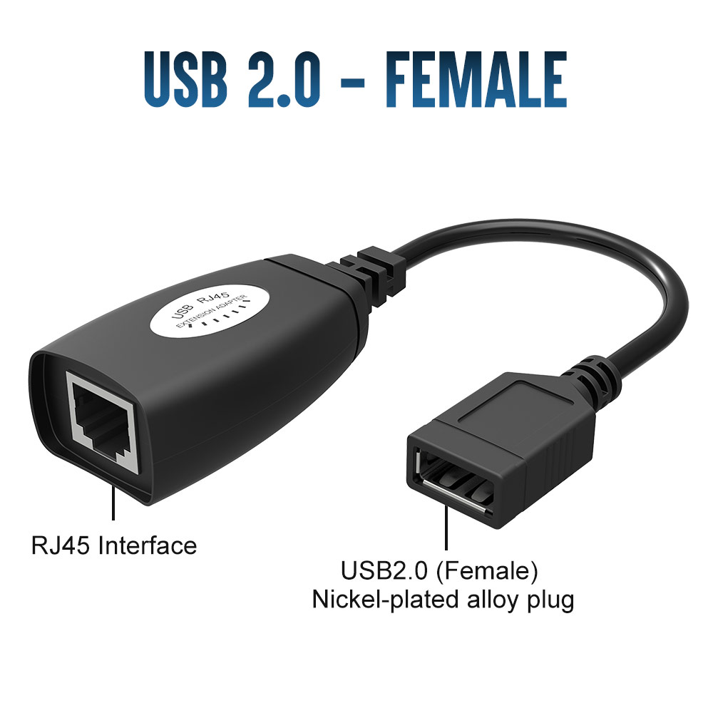 RJ45 Cat Cable Extension Cable USB 2.0 Extender Over RJ45 Cat5 Cat 5e Cat6 Cable Extension Cable Connector Adapter KitThis USB extension adapter allows you to connect your USB device to your computer at up to 150ft with the help of a Cat5/Cat5e/Cat6 patch cable. This adapter will allow you to have your computers, USB web camera, game console printer, mice, keyboard, or any other USB device exactly where you want it without having to move around your computer. Self-powered - this adapter does not require any external power source. It is compatible with most USB-compatible devices.Package includes 1 Pair of USB Extension Adapter:1 x RJ 45 + USB FEMALE Extension adapter1 x RJ 45 + USB MALE Extension adapter